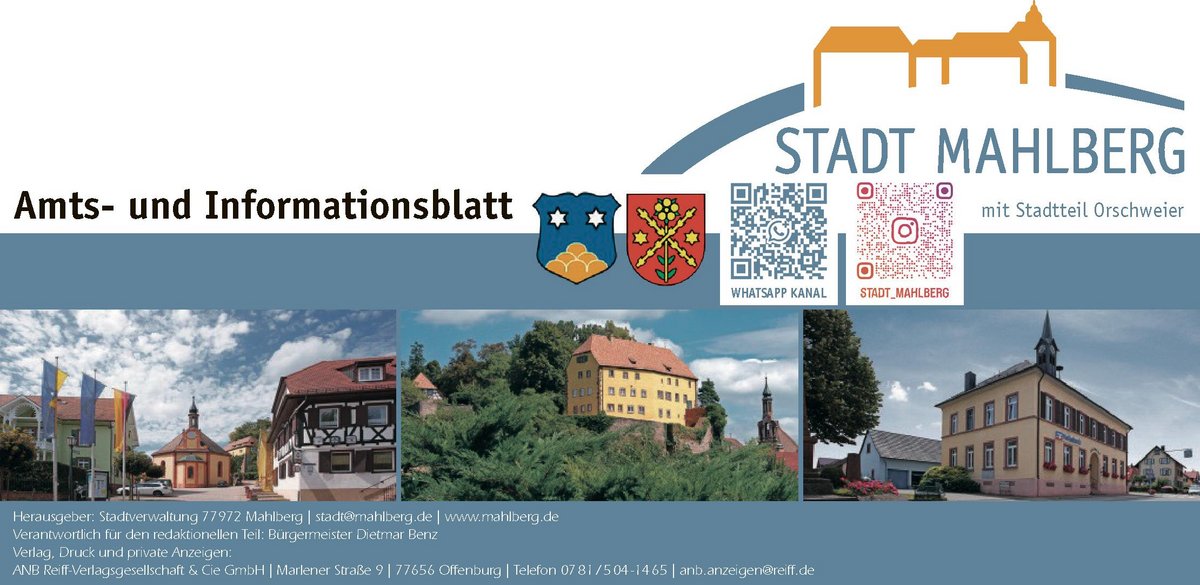 Verantwortlich für den amtlichen Inhalt einschließlich der Sitzungsberichte der Gemeindeorgane und anderer Veröffentlichungen der Stadtverwaltung Mahlberg ist Bürgermeister Dietmar Benz oder sein Vertreter im Amt, für den übrigen Inhalt der jeweilige Auftraggeber. Hier können Sie das aktuelle Mitteilungsblatt herunterladen.